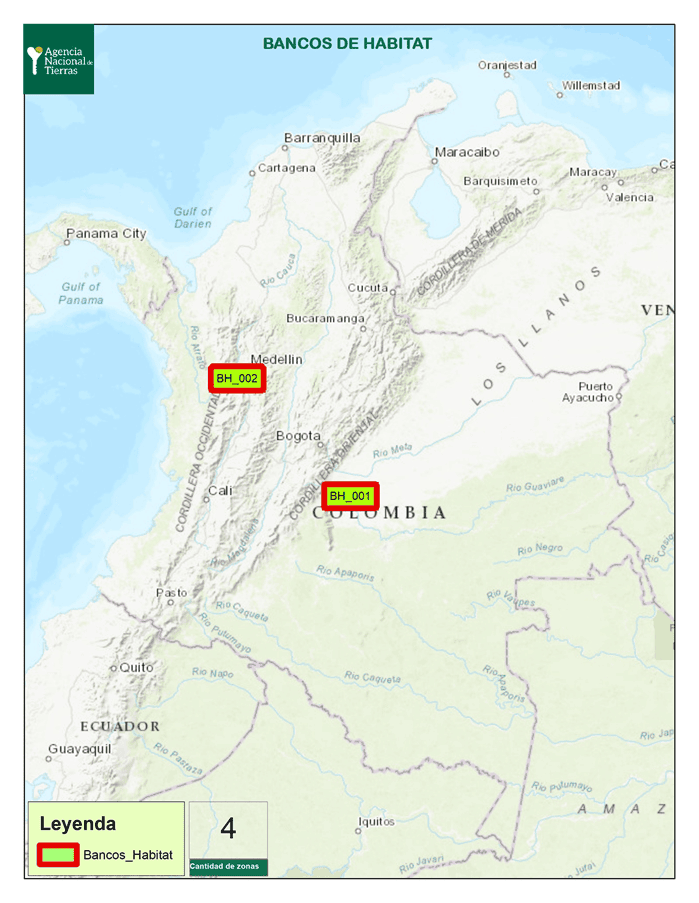 Fuente: Bancos de hábitat / Dirección de Bosques, Biodiversidad y Servicios Ecosistémicos; textos: Sarmiento, Mariana; Del Valle, Eduardo; López, Alexis; Osorio, Felipe; Hincapié Posada, Juan Esteban; Vieira Muñoz, María Isabel. Bogotá, D.C.: Colombia. Ministerio de Ambiente y Desarrollo Sostenible 2018.